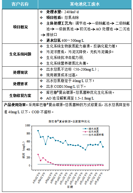 由于這類廢水水質(zhì)的特點(diǎn),廢水主要問(wèn)題常常是C/N比例失常,氨氮、總氮濃度較高,以及存在一定的重金屬污染,廢水具有一定的可生化性,但可生化性通常不高(B/C低),因此投加碳源,并選用處理能力強(qiáng)的特效菌種來(lái)改善水的可生化性就顯得尤為關(guān)鍵。